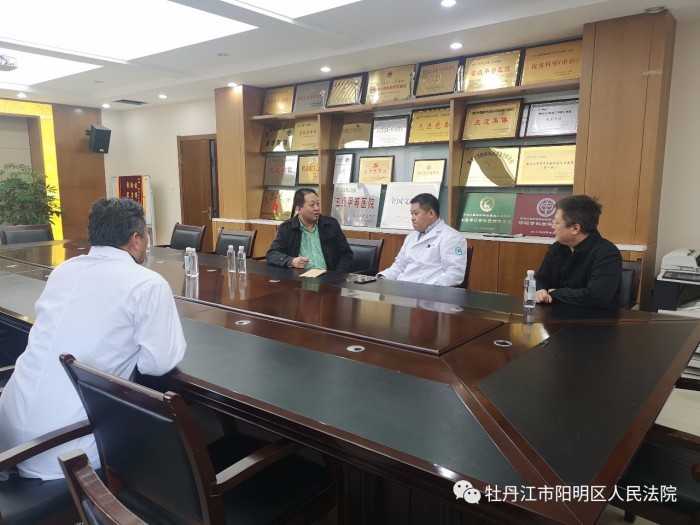 张海波副院长与周兆海副院长、于志远主任开展座谈,张海波副院长代表阳明区法院党组对贵院的鼎力相助和高尚付出表示衷心的感谢,在公开庭审的10天里,我们看到了一批敬业奉献、德医双馨的好医生,也看到了一个让全市人民放心的好医院。