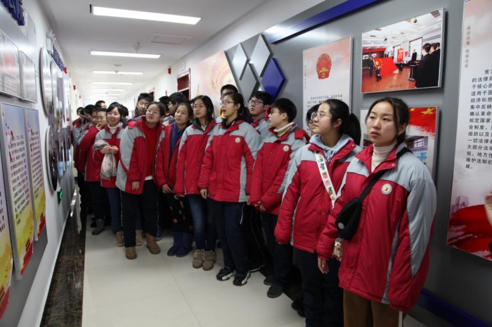 在讲解员的引导下,同学们继续参观了文化建设长廊、多功能审判庭等场所,来到家事审判庭后,同学们了解到了更加人性化的审判方式,并在甲骨文“和气” 的引申意义下,切实地体会到法院“以人为本”的执法理念。