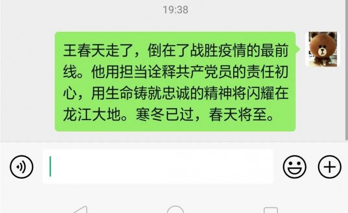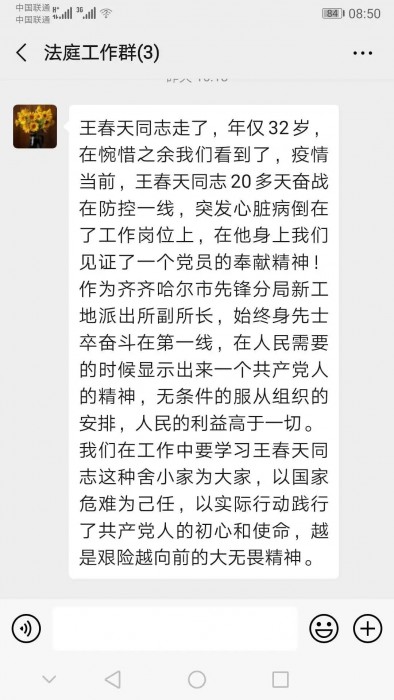 当家家户户沉浸在与家人团聚的喜悦和幸福中时,王春天同志将妻子和年仅16个月大的孩子送到岳母家,一心投入到抗疫一线,连续工作20余天,最后生命永久定格在2020年,春天同志这种无私奉献的精神时刻鼓舞着同是从事疫情防控工作的我们。相信疫情终将过去!
