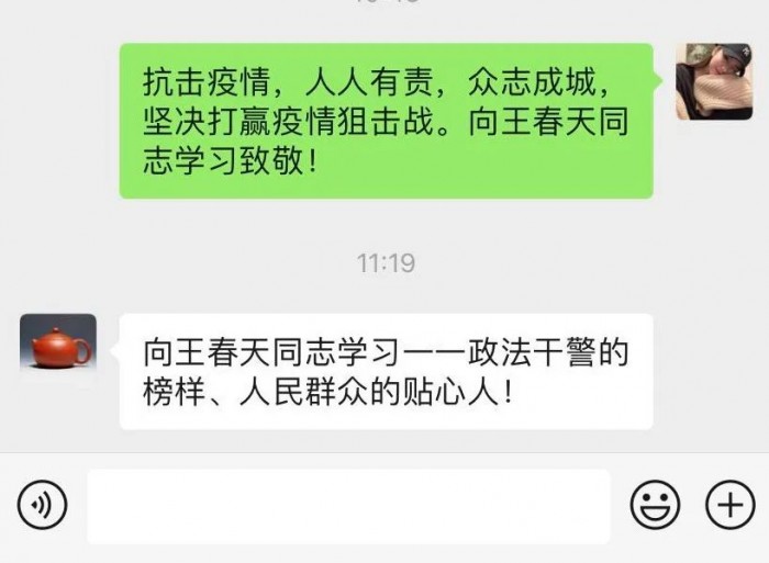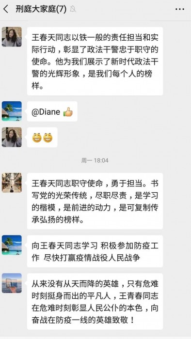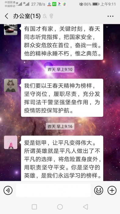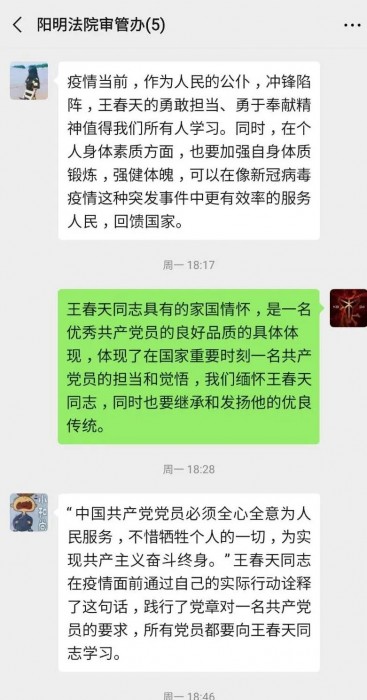 王春天同志虽已牺牲,但他却留下了春天般的温暖的和希望。为弘扬王春天同志不畏艰险、敢于担当的优良作风和顾全大局、一心为公的奉献精神,进一步振奋精神、鼓舞士气,阳明区法院迅速掀起王春天同志事迹、精神的学习热潮。分散办公也没有阻挡大家向春天同志看齐的决心,各庭室纷纷在庭室工作群中展开讨论,表达对王春天同志的缅怀和敬意,全院干警纷纷表示要以王春天同志为榜样,坚决打赢疫情防控阻击战。