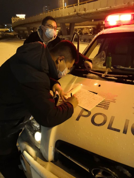 每晚23点后,各个卡点撤防,值班干警休息之后,他们的忙碌才刚刚开始。寒风凛冽的冬夜里,陈宇轩和李鑫在无人的街道上排查可能存在的隐患,在撤防后各卡点之间巡逻,对外来人员进行登记和管控。偶尔,他们的工作也有遭到群众的不理解,“大晚上的街上都没人了,你们巡查谁啊”,这时,他们总是会耐心的劝解,“正是有了夜间巡查,才让’病毒’无缝隙可钻啊,这样大家才可以安心的待在家中,减轻对疫情传播的担忧。”