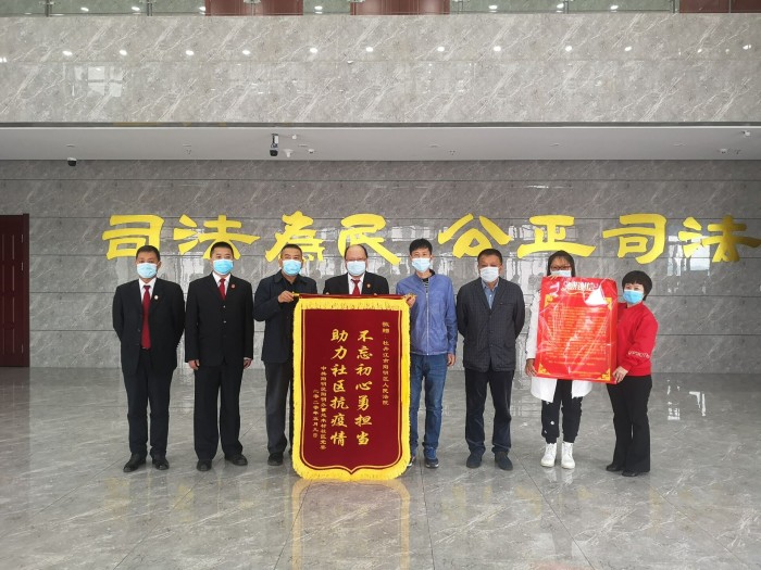 5月11日上午,阳明街道办事处刘永红书记、木材社区于海波书记来到我院赠送锦旗和感谢信。党组书记、院长马洪波,党组成员、副院长马东晓、执行警务局局长王伟东、五林法庭庭长曲国山代表全院抗疫值守干警接受锦旗和感谢信。