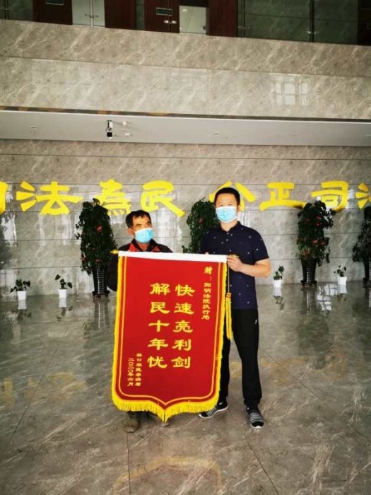 “真没想到执行局这么快就帮我拿回了执行款, 我为阳明区法院执行‘点赞’!”。近日,申请执行人李某来到阳明区法院,将写着“快速亮利剑,解民十年忧”的锦旗送到法警大队副队长张德磊手中,感谢法院高效的执行工作,将被拖欠十年的钱款追回,维护了其合法权益。