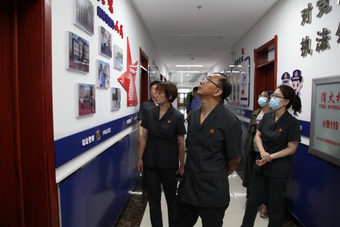 在讲解员的带领下,王金龙副院长一行先后参观了我院诉讼服务中心、调解室、科技法庭、家事审判庭、警械装备库、执行指挥中心、视频会议室、信息集控中心、远程提审和文化长廊等区域。