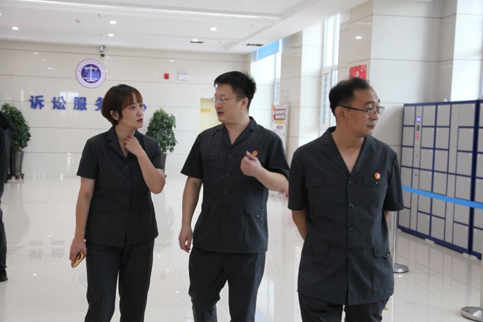 在诉讼服务中心,讲解员就诉讼服务中心的功能设置、立案和信访接待流程、12368诉讼服务平台热线及调解室、律师接待室等司法为民便民各项服务措施为干警们进行了详细的解说,并就我院基础设施建设及信息化建设取得的成绩、法院文化建设、队伍建设、党建工作情况向大家进行了详细的介绍。双方就基础设施建设、文化建设、信息化建设情况及诉讼服务工作进行了深入交流,王金龙副院长表示,阳明区法院科技感十足的设施设备和一流的便民利民服务值得学习和借鉴。