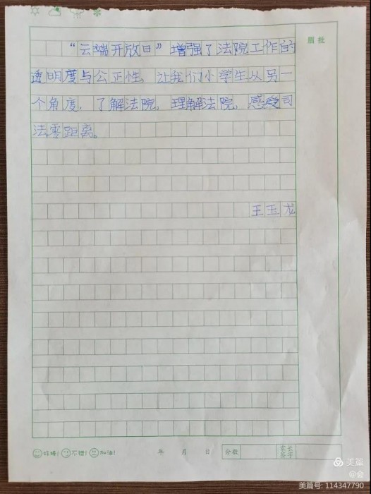 参加云端开放日活动后,孩子们写了心得体会。本次活动,让学生们更加了解了法院,进一步增强了青少年学法、知法、守法的法律意识。