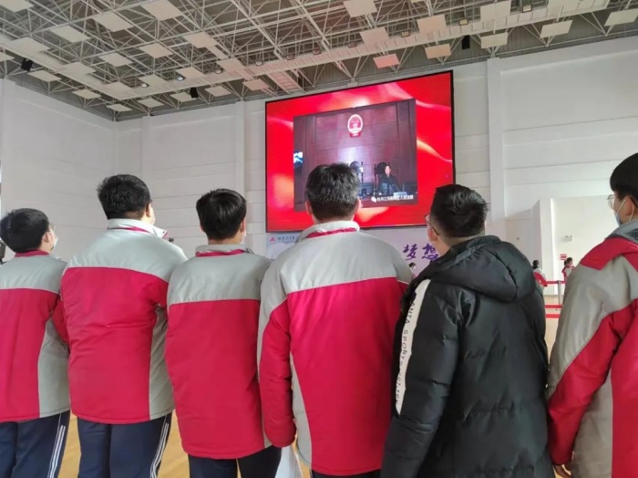 在第二中学体育馆二楼的文化舞台,通过大屏幕播放了阳明区法院“云端开放日”活动视频,学生们参观了文化长廊、廉政走廊、党建活动室、多功能审判庭、家事审判庭、诉讼服务中心等场所,感受到了法院审判的庄严肃穆,充分了解了法院职能、审判流程以及司法为民的各项举措,对法律的权威性和公正性、法庭工作的细致性和严谨性有了更深层的认识。