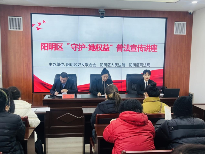 值妇女节前夕,阳明区司法局、阳明区妇女联合会,联合阳明区法院举办了针对女性社区矫正人员题为:阳明区“守护·她权益”普法宣传讲座会,刑事审判庭负责人杨阳以“社区矫正人员预防再犯罪及妇女权益保障”为题,向女性社区矫正人员作了专题讲座。