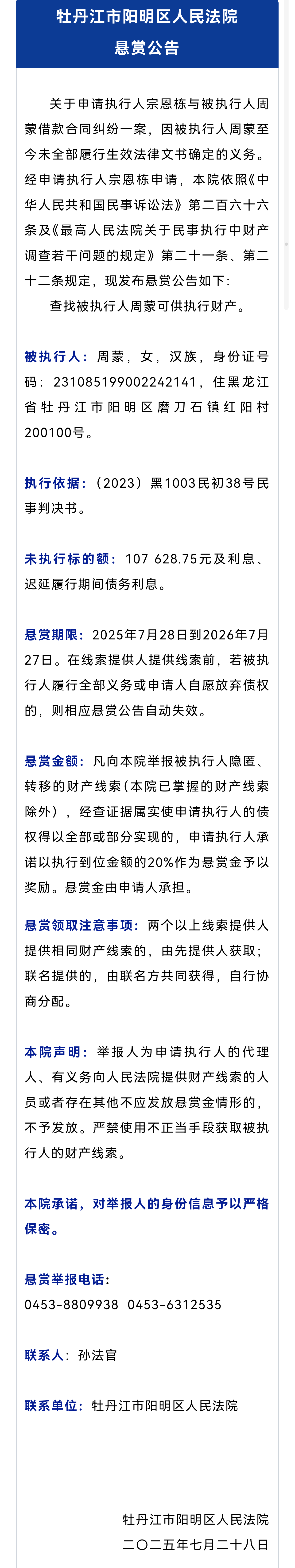 黑龙江省牡丹江市阳明区人民法院悬赏公告!