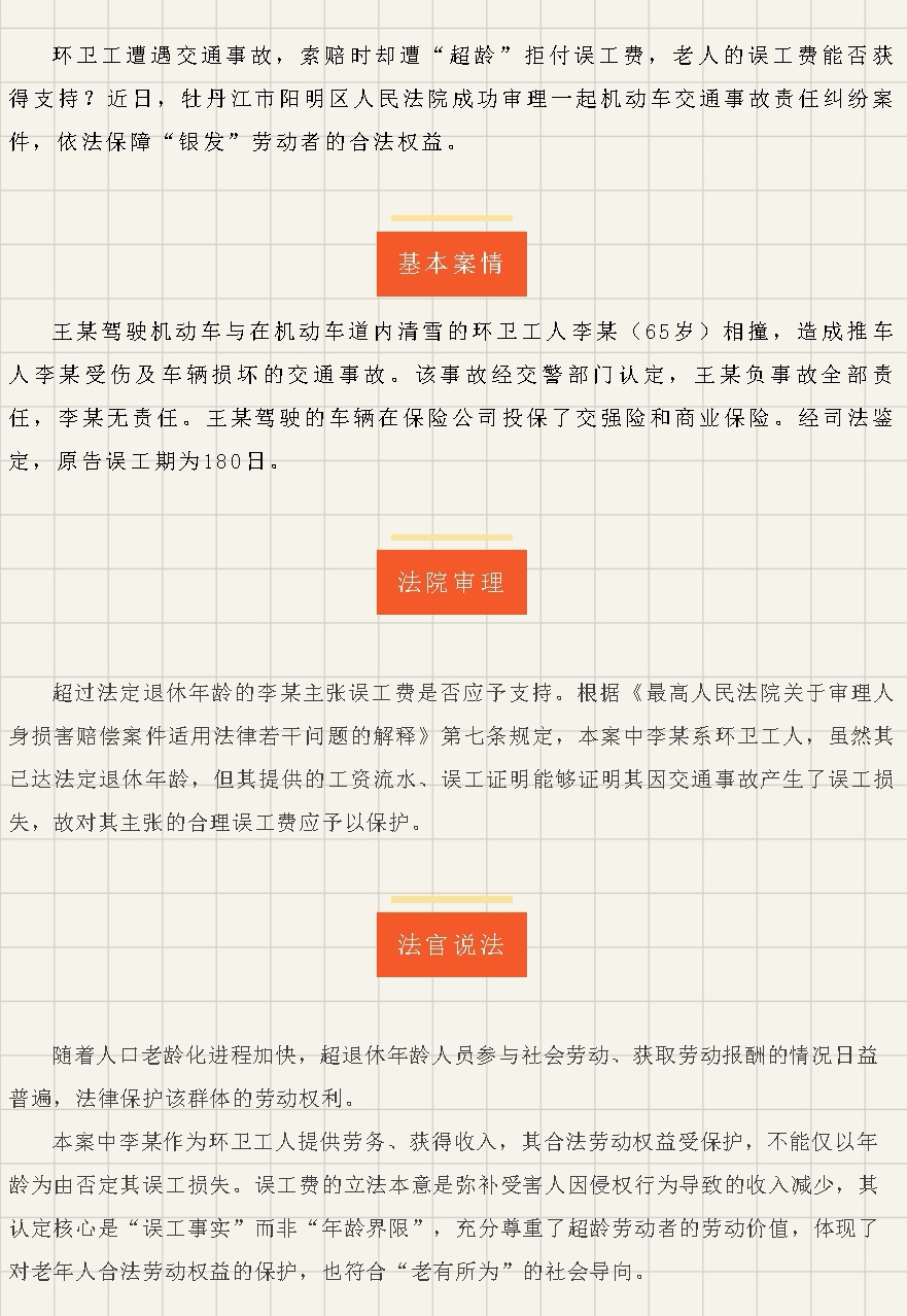 【以案释法】超退休年龄环卫工人遇交通事故 法院支持误工费赔偿