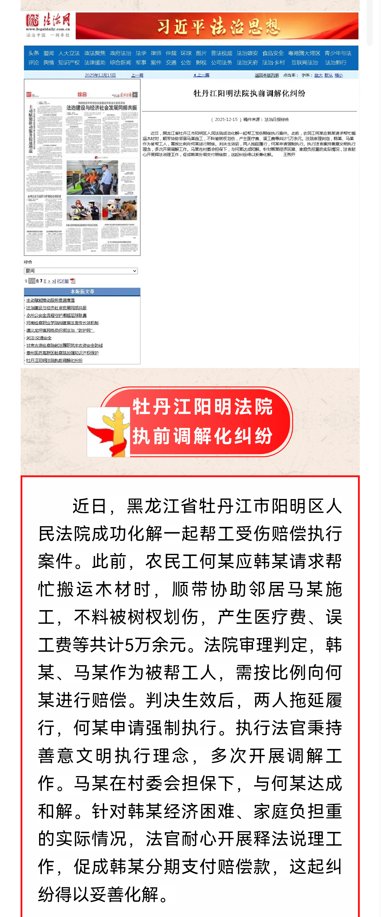【喜报】《法治日报》刊登牡丹江市阳明区人民法院执前调解化纠纷