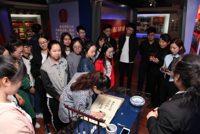 参观过后,法学院副院长李学锋在院史馆题字簿上留下笔墨——“德法双修,协同育人”,同学们也纷纷在题字簿上签名留字,为此次法院之行填上完满一笔。法学院学生代表孙嘉翔、杨永月发表感言,第一次法院之行为他们留下了极其深刻的印象,法院历史的厚重感和司法职业的神圣感,更加坚定了大家的法律信仰和对法律道路的无悔选择,激发了年轻人投身法律事业的热情,这种亲身经历让书本上的知识活了起来,使大家理解了学以致用真正的含义。同学们纷纷表示,回到课堂以后,将充分重视理论知识学习,为日后走入审判行业的理想信念奠定良好基础。李学锋副院长高度赞扬了阳明法院健康向上的法院文化,严谨专业的法官队伍,高水平的信息化建设及便民为民利民的服务举措,同时感谢我院提供“法院开放日”这一实践教学平台,希望能够以此为契机,进一步增强线上线下、校内校外的沟通协作,充分利用现有条件、挖掘潜在条件,建立健全法律职业标准,共同探索人才培养新道路,坚实转变学风,提高大学生就业能力。法院之行结束前,李学锋副院长嘱托同学们要把在法院的所见所闻所感带回到学校大环境中去,让这种坚守公平正义的正能量感染身边更多的人。