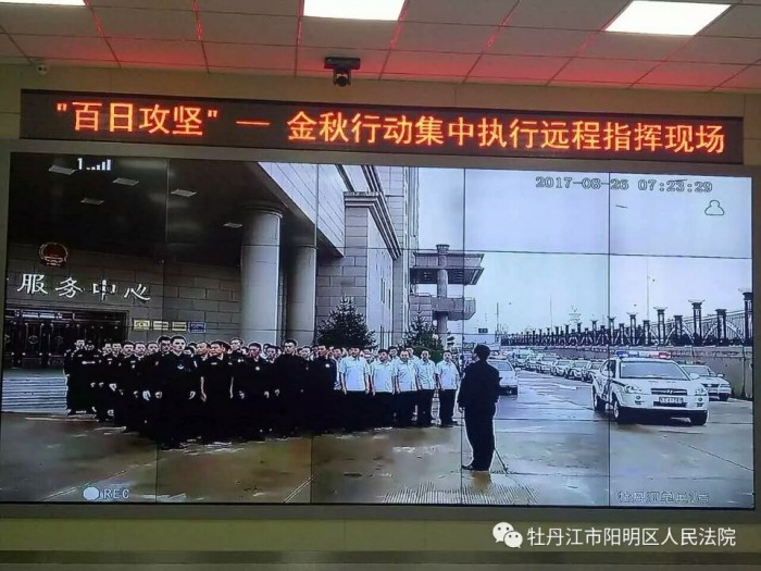 阳明区法院执行警务局本次行动出动警车3辆,干警15人,在牡丹江市中级人民法院发出行动开始的号令后,迅速出击,奔向各执行现场。截止26日早10点,阳明法院执行警务局共约谈当事人10余人。2案当事人在感受到高压的态势后主动要求达成和解,另有6名被执行人依旧表示无财产可以履行,执行法官依法对其下达了拘留手续。