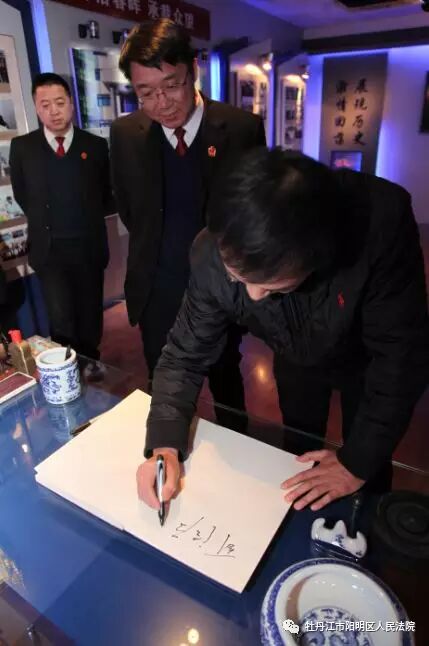随后,在院党组的陪同下,潘正军及代表一行体验了一场法文化的熏陶盛宴。在辉煌之窗,向代表们展示阳明区法院的光辉业绩。在文化建设长廊,代表们感受着法院深厚而活泼的文化气息,感叹道“咱法院也有文艺人儿!” 在院史展览馆,从历史沿革到星光沃土,一张张老照片翻起代表们对法院最初的记忆,一面面新脸孔也让大家唏嘘时代的进步。临别之际,区人大副主任潘正军在签名簿上题字——司法为民。