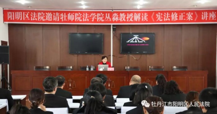 4月13日上午,阳明区法院邀请牡师院法学院丛淼教授为全院干警解读《宪法修正案》,二十余名人民陪审员参加讲座。丛淼教授理论联系实际,深入浅出地从如何理解宪法的维度,深刻剖析了宪法的内涵和功能,全面梳理和回顾了我国宪法制度的发展历程。从时代背景、重大意义、修宪程序、主要内容等方面,对新时代首次宪法修改进行了系统解读。围绕如何维护宪法权威、树立宪法意识、增强宪法自信、加强宪法实施,提出贯彻实施宪法的思路举措和方法途径。