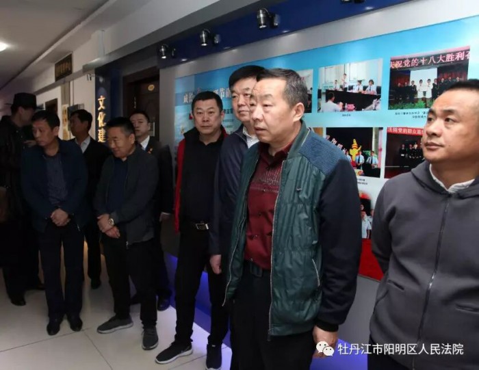 为加深人大代表对法院的了解,更加主动、有效的接受人大监督指导,4月24日上午,阳明区法院邀请区人大内司委副主任兼法制科教文卫委主任赵俊阳及区人大代表一行九人参观文化建设。院党组书记、院长徐常禄,院党组成员、副院长张海波、政工科科长郭玉荣、执行警务局局长王伟东陪同参观。