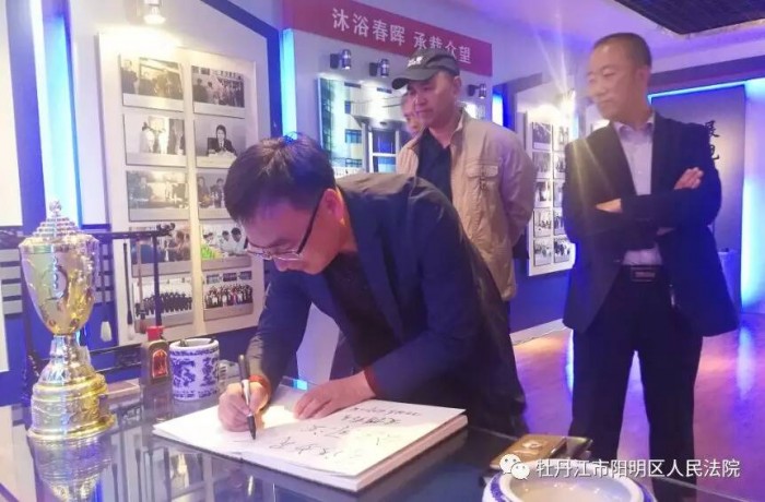 文化建设长廊多彩的照片集中展现了我院干警的才艺和丰富活泼的文娱生活,看着我院干警参加各种比赛时的飒爽英姿,朱镇长一行时时赞叹,“阳明法院真是人才辈出!” 走进院史展览馆,朱镇长一行在每块展板下驻足观看,对每张照片都充满了回忆。 “拖着天平的公正……”伴随着《阳明法院之歌》的响起,朱镇长一行听到了阳明区法院的齐心之声,看到了阳明区法院的合力之举。 临行前,朱镇长为我院留下墨宝。 他感叹:“今天我看到的法院更真诚也更真实,阳明区法院通过实际行动向大家呈现了一个真正公开透明的法院,一种真正可以走进来、带出去的法制文化,这样的法院之行我愿意再来几次!”