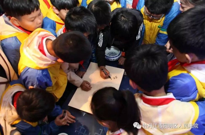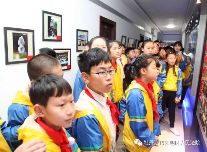 同学们首先来到了尊严之厅,齐声诵读烫金大字“司法为民 公正司法”,东西方文化浮雕寓意着法官兼收并蓄、海纳百川的情怀,同学们通过最直接的方式感受着阳光司法理念和温度。 在辉煌之窗,同学们看到了阳明区法院的傲人成绩和为民举措,同学们指着先优人物展板说道:“这和我们的光荣榜好像啊!” 来到文化建设长廊,干警照片墙和书画作品展让同学们看到了法官叔叔阿姨的另一面,丰富的文娱活动也让大家认识到了法院生活的另一面。 一进到院史展览馆,同学们就轻声感叹着,“这里好棒啊”“灯光真好看”,在院史展览馆,丰富的照片、实物展览和生动的影音展示,呈现了一个更为立体也更具历史厚重感的阳明区法院。 同学们积极踊跃的在签名簿上留下自己的名字。