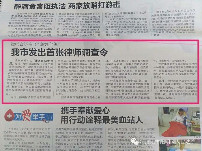 近日,阳明区法院发出全市首张律师调查令,7月18日,牡丹江晨报对此事进行了报道。