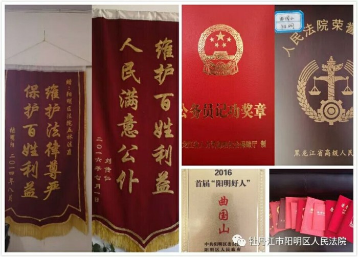 曲国山,男,1967年4月2日出生,汉族,中共党员,大学文化,现任阳明区法院党组成员、五林法庭庭长。曲国山是五林镇土生土长的农民,自1988年通过考试进入法院后,便一直在五林法庭工作,至今已有30年。30年来,他不忘初心,扎根基层,多次荣获阳明区优秀公务员及我院先进个人荣誉称号, 2012年荣获全市法院“调解能手”,2014年荣获全市法院“办案标兵”,2015年荣获全省“调解能手”荣誉称号,2015-2016荣获全省政法系统先进个人,2016年荣获全市法院“办案标兵”、全市“好人之城·最美政法卫士”,2017年荣获全市法院“调解能手”等荣誉称号。