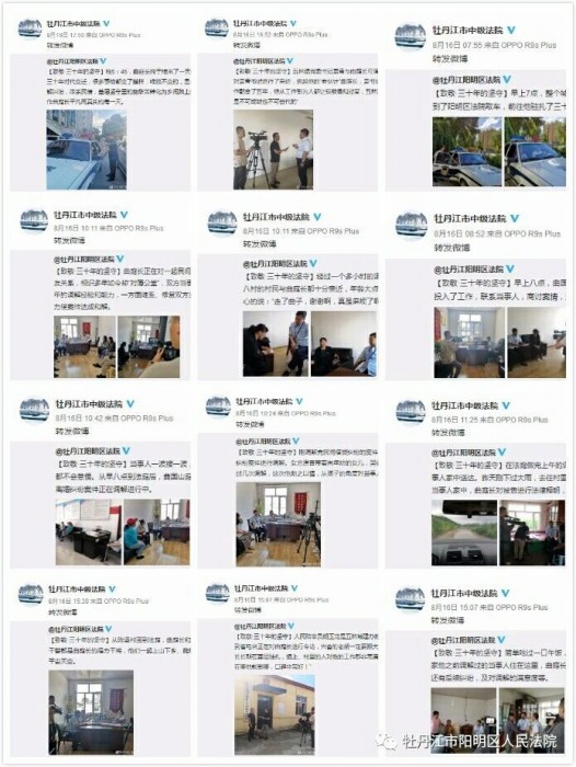 2018年8月16日黑龙江省电视台新闻频道摄制团队对阳明区法院五林法庭庭长曲国山的一天进行了跟踪拍摄中级法院及阳明区法院利用官方微博开展实时直播共发布微博26条,总阅读量达11281次同时,微信朋友圈实时转播,扩大影响取得良好宣传效果曲国山庭长的一天会是怎样度过呢让我们跟随镜头,一同走进曲庭长平凡而忙碌的一天