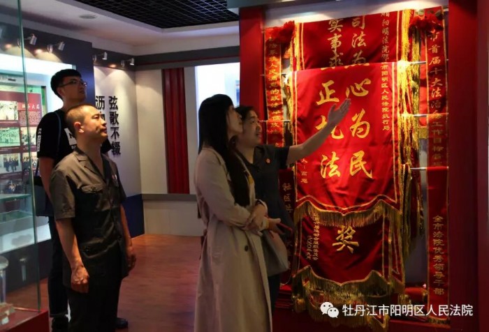 法院初印象——尊严之厅董教授一行首先观摩了一起建设工程施工合同纠纷案件的庭审,“让人民群众在每一个司法案件中感受到公平正义”从一句司法理念变为亲眼所见、亲身感受,第一次观摩庭审,现代化的庭审模式重新定义了大家心中的法院和法官形象。尊严之厅由象征东西方文化的浮雕和“司法为民、公正司法”八个大字组成,在这里,嘉宾们感受着“司法为民、公正司法”沉甸甸的分量和法官们“兼收并蓄、海纳百川”的为民情怀。法院初印象——尊严之厅工作多硕果——辉煌之窗辉煌之窗是阳明区法院文化建设的核心,这里有省院领导的嘱托和希望,有中院领导的目标和信念,有我院党组的决心和方向。在这里,嘉宾们初步领略了阳明区法院的风采和成绩。感受过庭审的庄严与严肃后,文化建设长廊的氛围给嘉宾们展示法院的另一面。具有亲和力的照片墙,干警们亲自拍摄的摄影作品、亲自书写的书法作品,还有参加各种体育竞技、文艺比赛、拓展训练的照片,一个生动立体的法院、有血有肉的法官形象重新树立在嘉宾们心中。文艺新天地——文化建设长廊追溯历史,开创未来——院史展览馆来到院史展览馆,嘉宾们跟随一张张照片和旧物重温了阳明区法院的历史,也感受着阳明区法院“厚德、尚法、务实、创新”贯穿发展始终的司法理念。