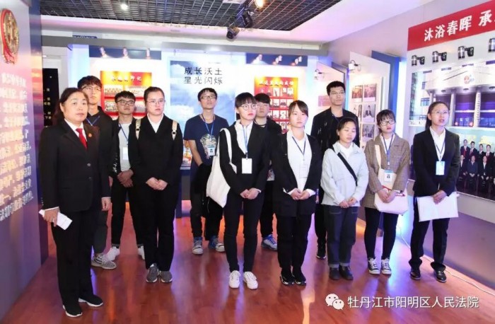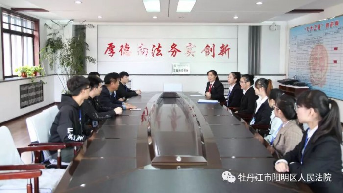 院党组成员、政工科科长郭玉荣同尹院长、同学们开展座谈。尹院长表示,阳明区法院历来是接收法学院实习生最多的单位,感谢阳明区法院对牡丹江师范学院法学院的支持,希望阳明区法院对实习生严格要求,培养其社会实践能力。郭科长表示,阳明区法院作为牡丹江师范学院的实践教育基地,会全力投入共同建设人才交流平台,共同繁荣司法、教育事业。参观尊严之厅,感受法官“海纳百川、兼收并蓄”的情怀。参观辉煌之窗,领略阳明区法院的荣誉和风采。参观文化建设长廊,看见不一样的法院与法官,法院生活丰富多彩,法院干警多才多艺。参观院史展览馆,阳明区法院的沧桑巨变和满枝硕果在同学们心中留下深刻印象。